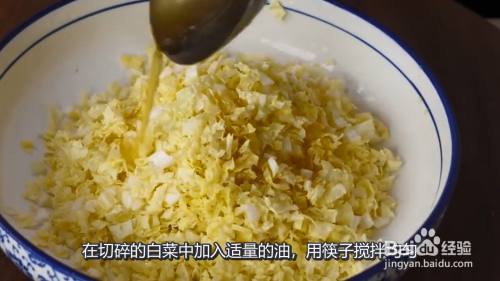 在切碎的白菜中加入适量的油,用筷子搅拌均匀,这样能锁住水分,拌匀后放一旁备用。