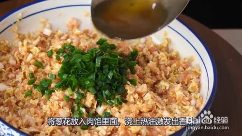 将白菜剁碎放入食用油锁住水分,肥瘦均衡的肉剁碎备用,在肉馅中加入姜末、料酒、生抽、老抽、蚝油、芝麻香油,搅至上劲,打入鸡蛋继续搅拌,将肉馅放入白菜里面进行调味,放入葱、淋上热油,搅拌均匀即可。