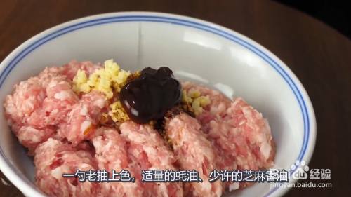 在肉馅中加入适量的姜末,少许的料酒去腥,两勺生抽提鲜,一勺老抽上色,适量的蚝油、少许的芝麻香油。