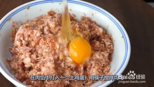 在肉馅中打入一个土鸡蛋,用筷子搅拌均匀,这样做出来的肉馅营养丰富更好吃。