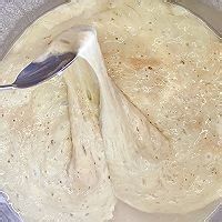 将上面一层清澈的水轻轻倒出,尽量不惊扰盆地的淀粉。水倒出后用干净的汤勺将盆地的面浆淀粉搅拌均匀,由于淀粉长时间沉淀,底层凝固发硬比较难搅拌,所以搅拌过程要耐心一点,毕竟离吃到凉皮只剩一步之遥了,坚持就是胜利!