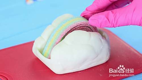 把云朵粘在翻糖底座上。