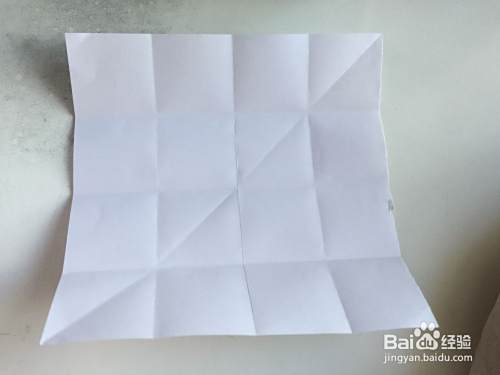 再另一个方向中线对折,对折之后,再重复上一个步骤,以中线为标准,再两边中线对折。完全对折之后,会出现16个正方形的格子。如果没有出现16个正方形格子就是不对的。