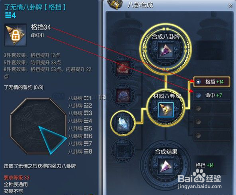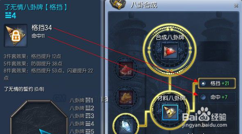 可以看到图中[了无情八卦牌\的34点格挡被折算成21点,11点命中被折算成了7点,但是都还没有达到合成八卦属性的最大值。