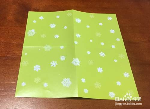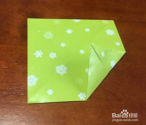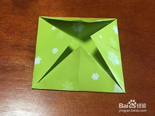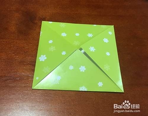 取绿色彩纸,对边折叠,出现十字折痕,然后四个直角向中心折叠,翻面,继续将四个直角往中心折叠。