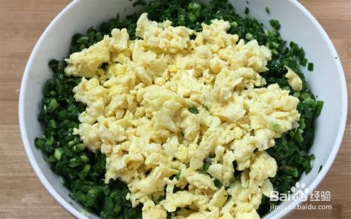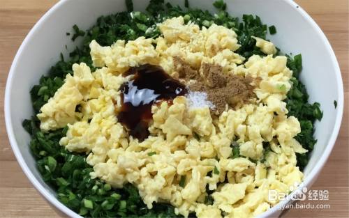 现在开始调馅,放入鸡蛋碎、姜末、胡椒粉、盐、鸡精、香油、再放点蚝油增加点味道。