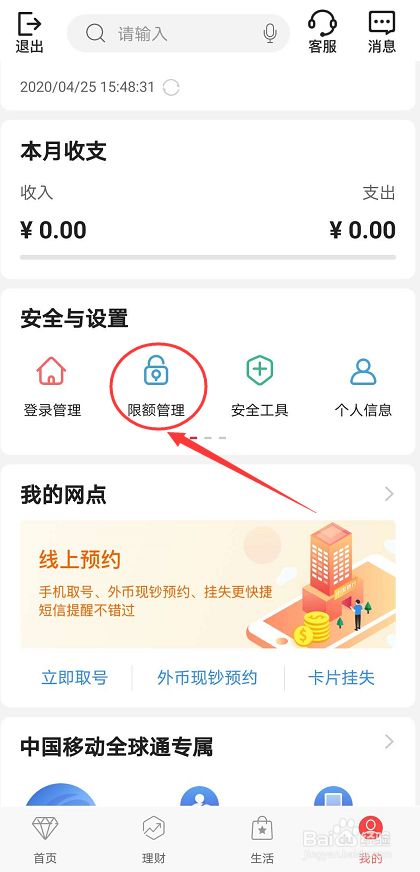登录验证通过后,选择【安全与设置】中的【限额管理】选项