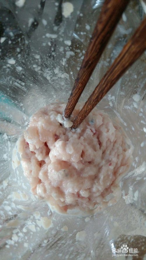 加入适量的淀粉,用手均匀触碰,并用手顺时针搅拌,使肉末变浓。