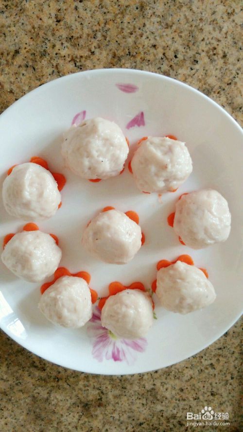 放入盘里摆放好,将鱼蓉用手挤出大小均匀丸子,放在胡萝卜片面上。冷水上锅滚开蒸6分钟。