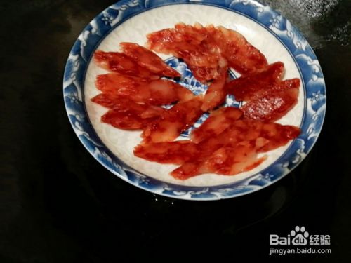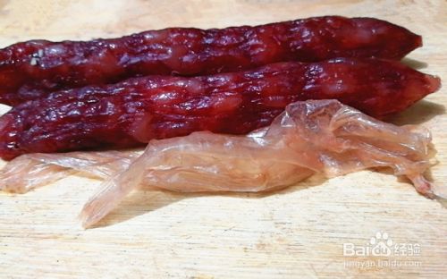 先把香肠和一层胶纸撕掉,再切成片备用。
