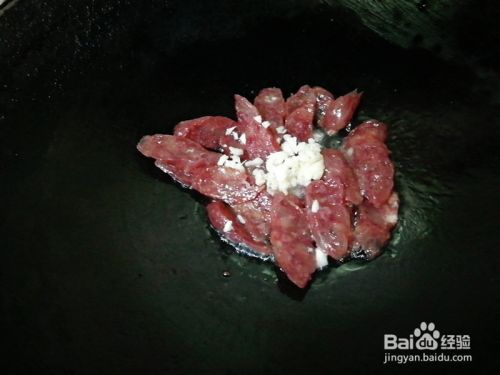 另起锅,先把香肠和大蒜放下去翻炒一分钟左右。,