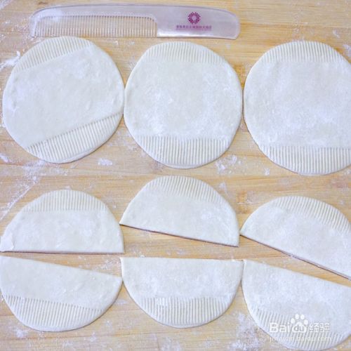 这一步需要一个道具:一把普通的梳子,必须是干净的。家里有出差旅游带回来的一次性梳子,提前清洗晾干后备用。用梳子的齿牙将3张饺子皮两边按出一排齿痕,再用刀将面皮从中间一切两半,3张面皮就变成6个半圆了。