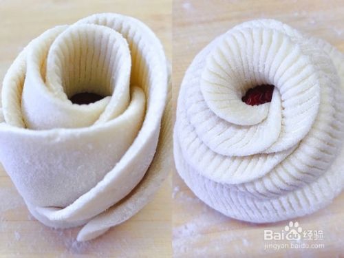将卷好的面饼立体的站在案板上,就会看到一朵花的雏形,红枣已经完全被面皮包裹在花芯中了,没关系,用手将每一片花瓣轻抚掰开,一朵悄悄绽放的花儿就开好了,红枣就是它的花蕊。