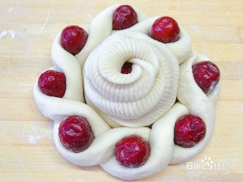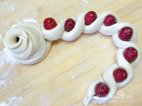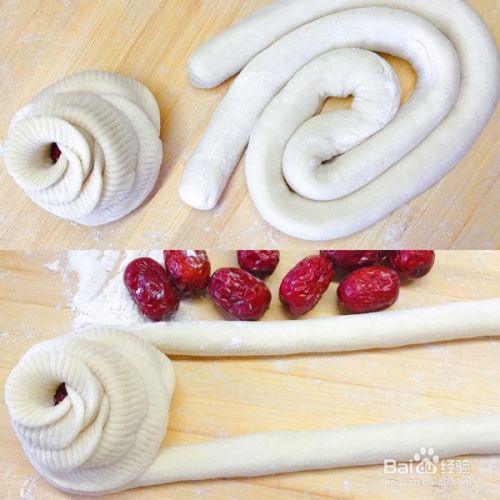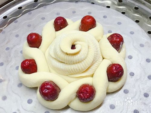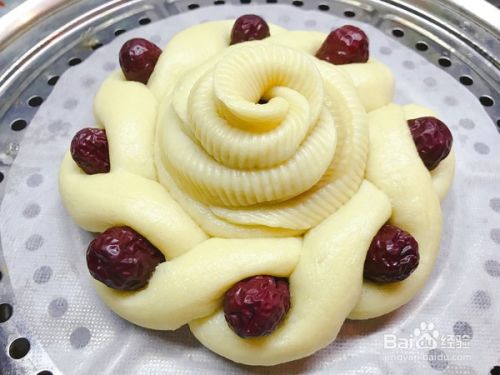 像编辫子一样交叉编辫子,每一个交叉点放一颗红枣,如此反复,根据花朵的大小直径,我这个枣花馒头需要8颗红枣就够围绕一圈了。