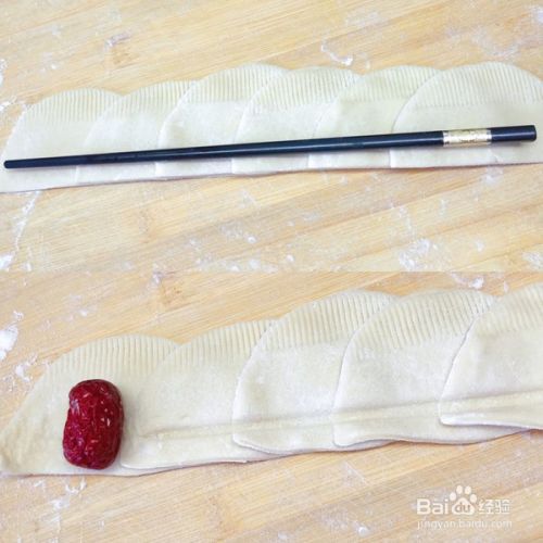 将6片半圆的面皮均匀码放在一侧,取一根普通的筷子在面皮的切面根部用力按压,这一步的作用是为了将6片面皮黏合在一起。取一枚红枣从面皮的一侧像卷饼一样卷起来。卷的时候注意不要把梳子齿痕的一侧花边弄皱了,待会儿出来的花瓣就不美观了。