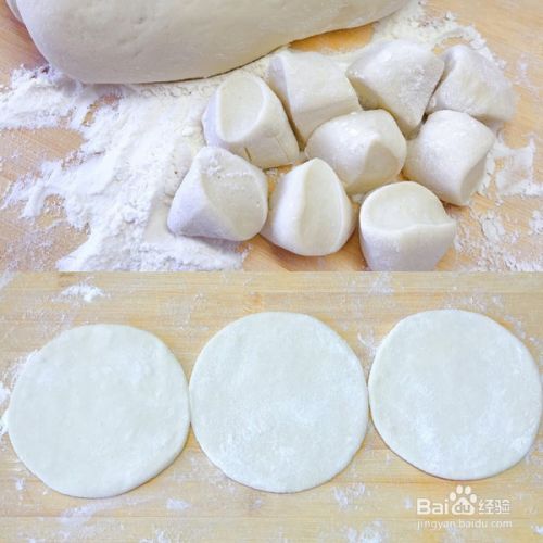 发酵后的面又黏又软,需要在案板上撒一层干面粉,再把面团从面盆里挖出来,放在大案板上揉面。用力反复将面团中的气孔挤出,分成大小均等的小剂子,将3个小剂子按扁后再用擀面杖擀成厚厚的饺子皮状。北方人的厨房,一般都会备有竹子做的大案板,就是为了方便做馒头包子面条之类的面食的,得手的厨具在做面食的时候事半功倍。