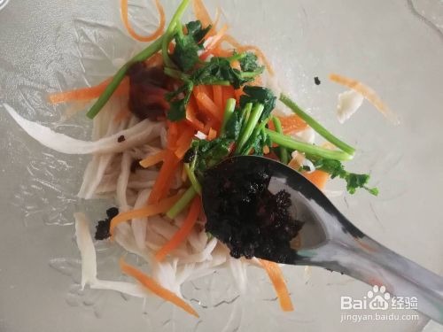 杏鲍菇里加1勺香醋,1勺辣酱,半勺耗油,半勺白糖,少许盐和芝麻油。