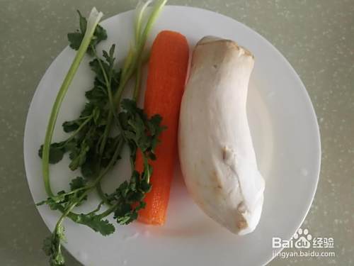 准备一个杏鲍菇,一段胡萝卜,少许香菜,人多食材的量可以增加,这儿凉拌的是作为一个小菜,量少而精。