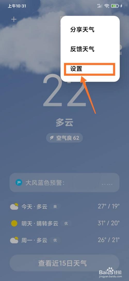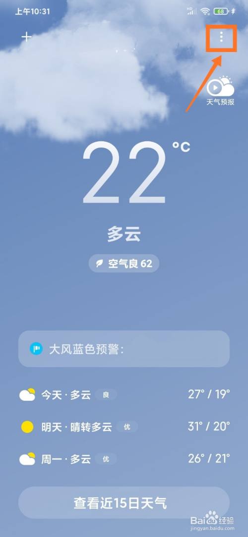 进入“天气”界面后,点击箭头处的“三个点”按钮。