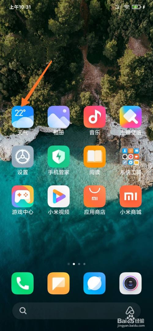 打开手机,点击箭头处的“天气”按钮,如下图所示。