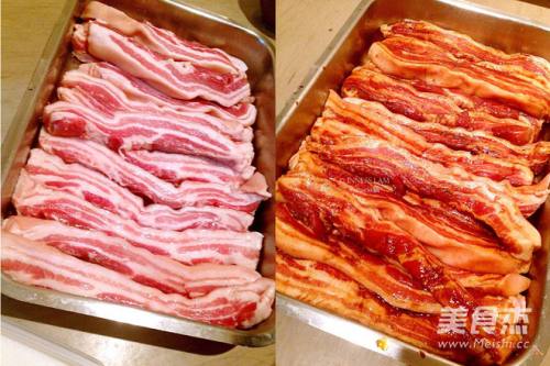 1五花肉切条,放进一个大容器内(我用的是大钢盘),把所有调料倒进去,混合均匀。腌一个白天,翻面再腌一个晚上,约24小时。(腌制时间比较长,为了让肉充分吸收到腌料的味道)