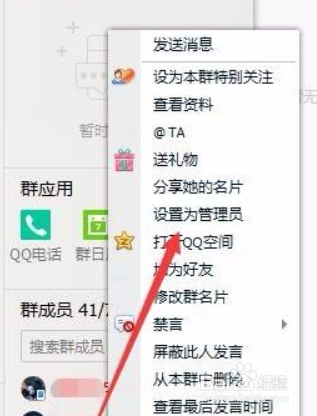 打开qq群聊天界面,右下角的群成员列表中找到需要设置为群管理员的那个人,鼠标右键选择设置为管理员。