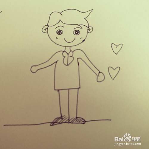 第四步,我们来画卡通新郎的双腿和双脚。