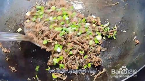 锅留底油放入梅菜炒,炒均匀后放入蒜苗翻炒均匀备用,腌制好的肉摆放到碗中。