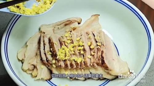 焯水的五花肉用签字扎一下猪皮,上面抹上一层蜂蜜,把肉放入锅中炸至金黄捞出切片。