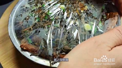 把肉上面放炒好的梅菜,盖上保鲜膜,放锅中蒸一个小时,时间到后取出倒入盘子里面即可。