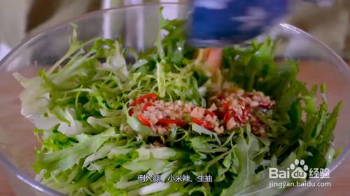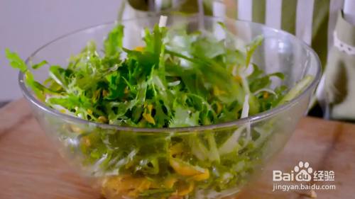 将焯水后的苦菊调好味,加入蛋丝和花生碎,翻拌均匀即可食用,具体的操作步骤如下: