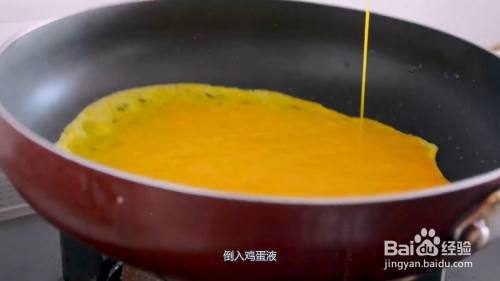 锅热烧油,倒入鸡蛋液,将蛋液摊成蛋皮后,盛出备用。