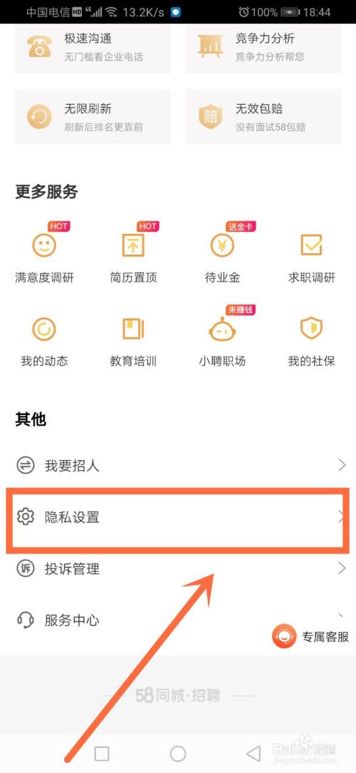进入我的求职界面后,点击【隐私设置】的功能进入。如下图所示