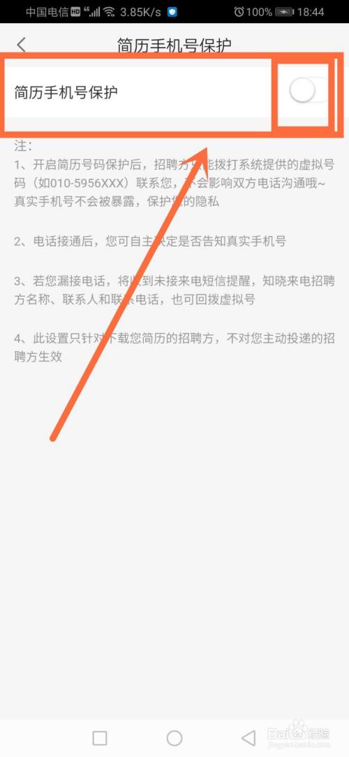 进入隐私设置界面后,点击【简历手机号保护】一栏功能进入。如下图所示