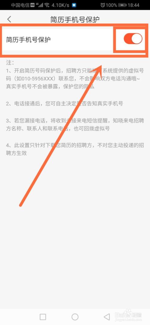 进入界面后,点击【简历手机号保护】后面的【开启按钮】进入。如下图所示