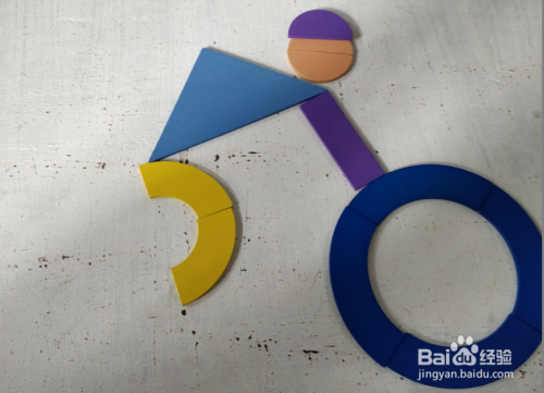 摆上四个挨着的长弧形,放在黄色弧形左侧挨着,如图。这样就拼组好了。