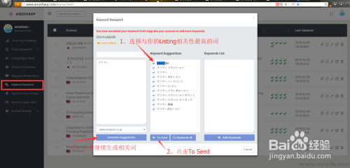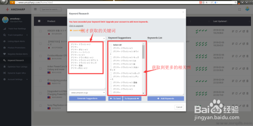 上图中下拉框弹出的就是亚马逊官方提供的该关键词搜索最频繁的相关词。对比使用AMZSharp的Keyword Research功能就可以完全替代上面的操作而得到下拉框的提示相关词