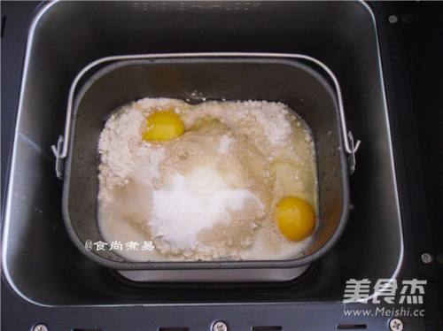 1面包机桶内加入清水、白糖、将所有面粉倒入面包机桶内,放入酵母,最后敲入鸡蛋,遮上盖子、通电、选择揉面功能键,整个揉面时间30分钟,15分钟后放入黄油,继续揉面至结束
