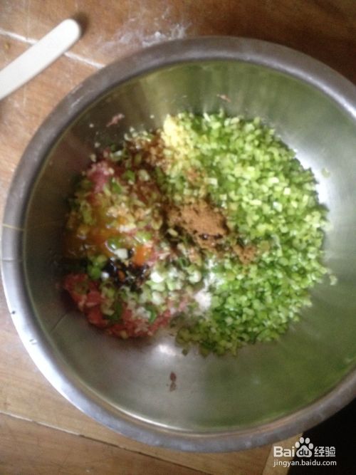 取出买回来的肉馅,(也可以买肉回家自己剁)加入刚才准备好的,麦芹、葱花、姜末,接着调味,依次加入盐、味精、鸡精、香油、十三香,菜油、少许老抽,搅拌均匀即可,然后先放入冰箱,下来我们要做饺子皮。
