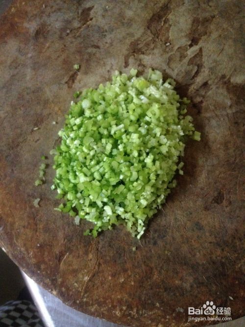 取小麦芹,择掉叶子切掉根部,洗净沥干水分,剁碎备用(麦芹不像芹菜,不用加盐杀水份)。