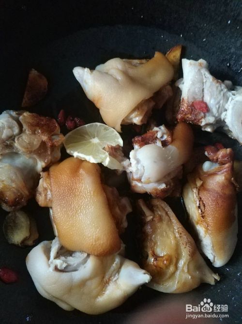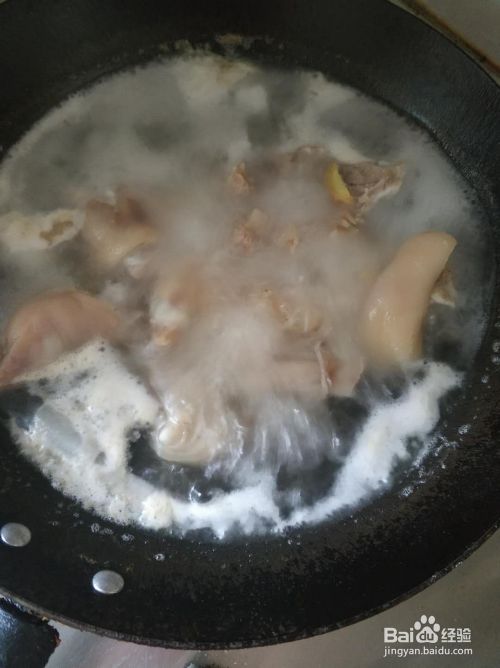 锅里放入凉水,待水开后放入猪蹄,在放入两片柠檬,葱姜等。如下图所示