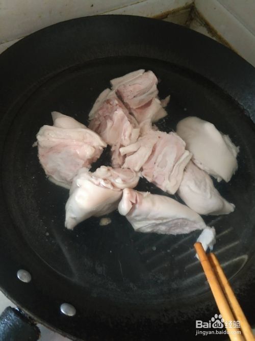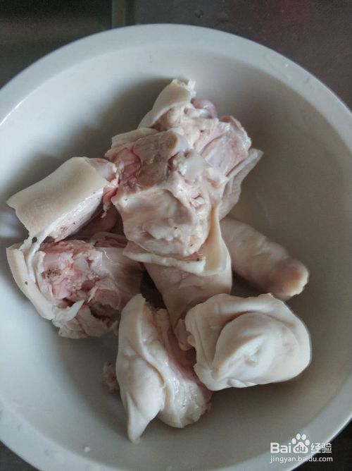 用勺子将锅里的浮沫去掉,然后锅里的水倒掉,猪蹄用凉水过一下,如下图所示,