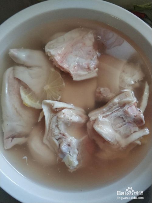 准备好猪蹄,用清水放入两片柠檬泡半个小时左右,如下图所示。