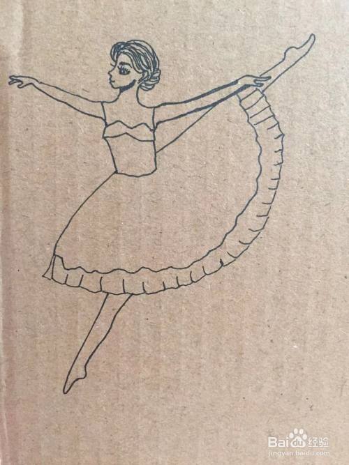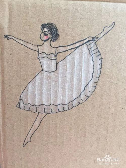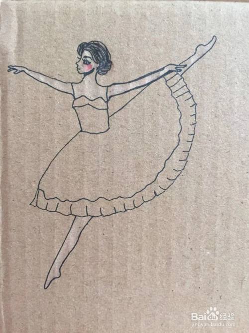 用笔画出芭蕾舞者的服装,我们画出裙摆。用笔画出芭蕾舞者的腿部和双脚。米色彩铅画笔为舞者的肤色上色,红色彩铅画笔画出腮红。
