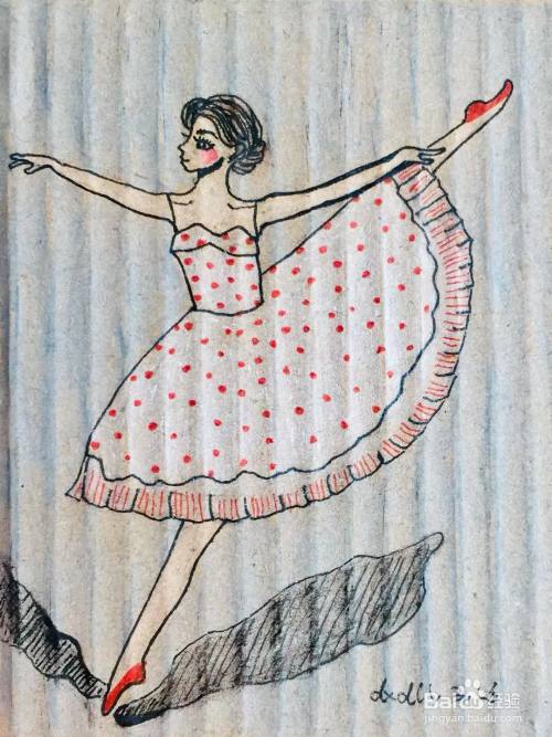 红色勾线笔在芭蕾舞者的服装上,画出装饰的圆点图案。红色勾线笔画出芭蕾舞者的鞋子。我们在其脚下画出阴影轮廓,用倾斜的线条覆盖表面。黑色勾线笔为阴影上色。