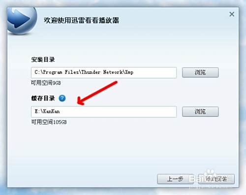 双击下载的安装软件进行播放器的安装,首先选择“自定义安装“然后”下一步“,”安装目录“和”缓存目录“可以通过”浏览“按钮进行修改,也可以保持默认状态,此时要记住“缓存目录”的位置,最后点击“开始安装”。