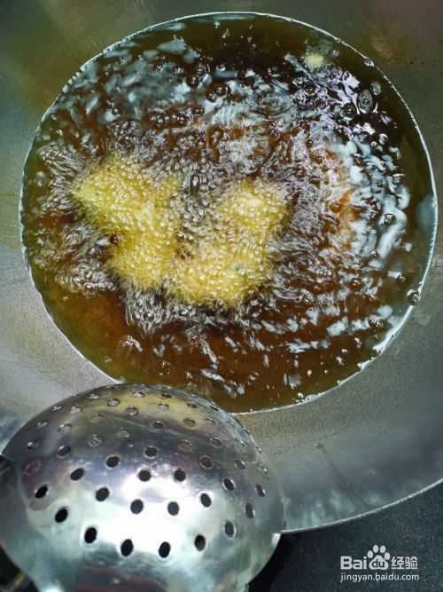 炸到表面定型略带黄色时,捞出来沥一下,让锅中的油温加升到七成左右。