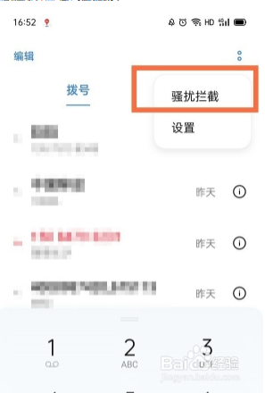 在手机电话设置界面中,找到并点击骚扰拦截功能,打开该功能设置界面