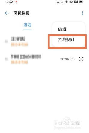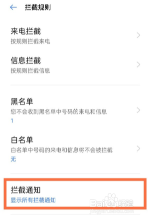 在骚扰拦截页面下,浏览并找到拦截规则功能,点击选择打开