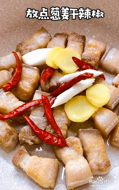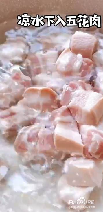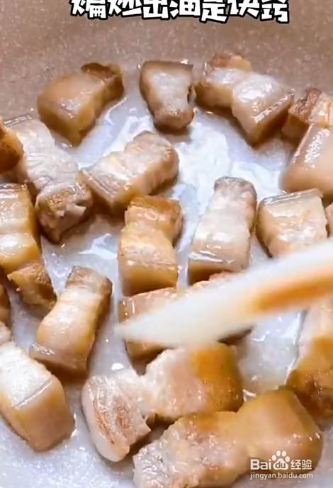 接着捞出五花肉清洗干净,倒入锅内煸炒出油脂